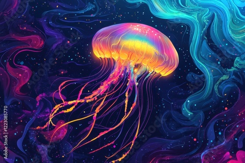 © Namdang, Naklejka premium Vibrant Jellyfish Floating in a Cosmic Dreamlike Ocean Scene