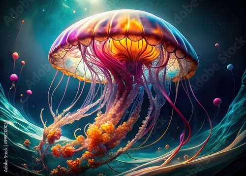 © Sandra, Naklejka premium Vibrant Jellyfish Illustrations Showcasing Intricate Details of Underwater Creatures in Motion