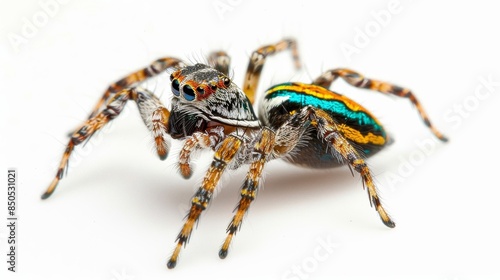 © Shozib, Fototapeta premium Vibrant jumping spider perched on a white surface, displaying its colorful body and large eyes