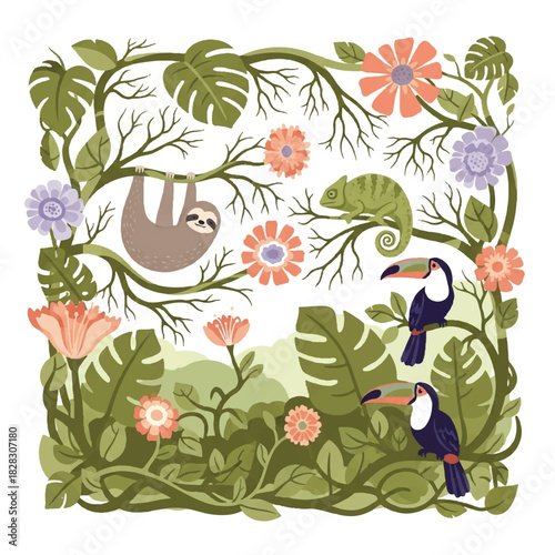 Obraz premium Vibrant jungle illustration featuring a sloth, chameleon, and toucans...