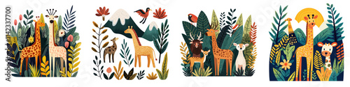 Fototapeta premium Vibrant Jungle Landscape with Diverse Wildlife Animals including Giraffes...