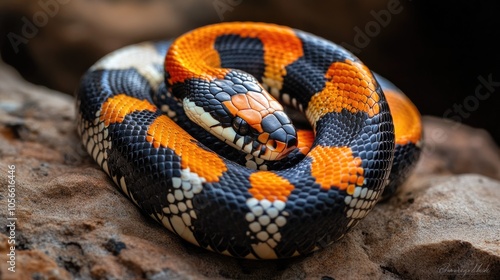 Obraz premium Vibrant King Snake Coiled on a Rocky Surface in its Natural Habitat