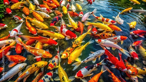 © Adisorn, Fototapeta premium Vibrant koi fish with stunning red, yellow, orange, black, and white hues swim peacefully in a serene fish pond, creating a soothing ambiance in a garden oasis.