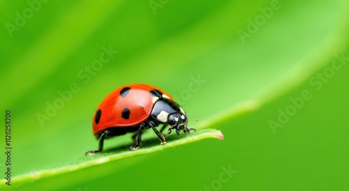 © Viam, Naklejka premium Vibrant ladybug on fresh green leaf in nature