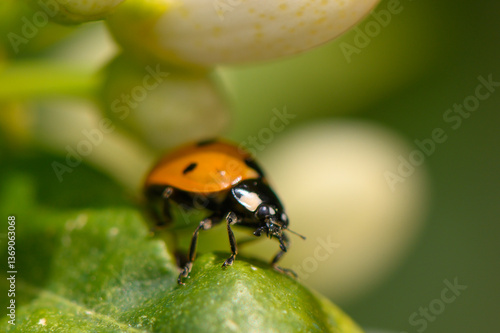 © Михаил Шорохов, Fototapeta premium Vibrant ladybug resting on a green leaf in a lush garden during a sunny afternoon