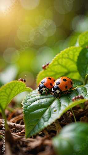 © ON - Studio, Fototapeta premium Vibrant ladybugs resting on green leaf, nature's beauty
