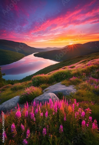 Fototapeta premium vibrant landscape bathed bright sunrise hues colorful skies lush greenery,...