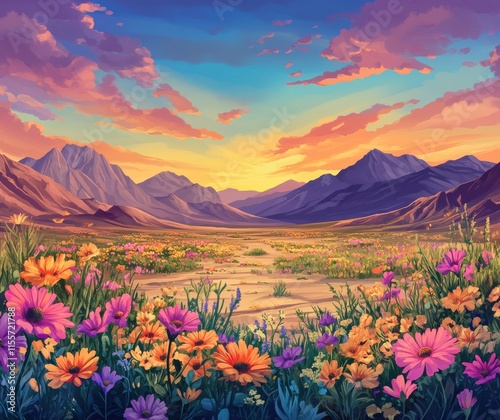 Fototapeta premium Vibrant Landscape with Colorful Wildflowers at Sunset Over Majestic Mountains...