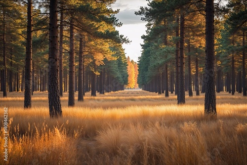 © Michael, Fototapeta premium Vibrant Larch Forest in Sweden Showcasing Golden Grass and Warm Autumn Colors