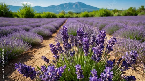 Fototapeta premium Vibrant lavender blossoms in valley, blue sky backdrop