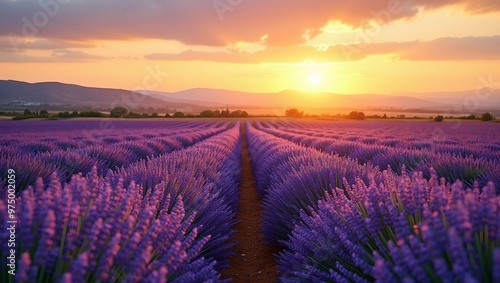 © GMeta, Fototapeta premium Vibrant lavender field at sunset with rolling hills and golden sky