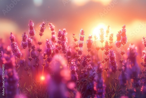 © NikahGeh, Obraz premium Vibrant lavender field bathed in warm sunset light.