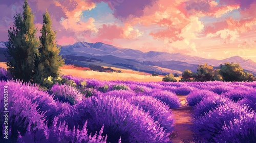© wacharagorn, Obraz premium Vibrant lavender field under a colorful sky at sunset, showcasing nature's beauty in a serene landscape.