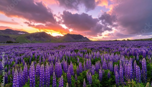Fototapeta premium Vibrant Lavender Field Under Dramatic Sunset with Dark Clouds