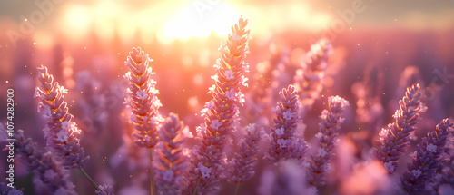 Fototapeta premium Vibrant lavender fields basking in the warm glow of a sunset, creating a...