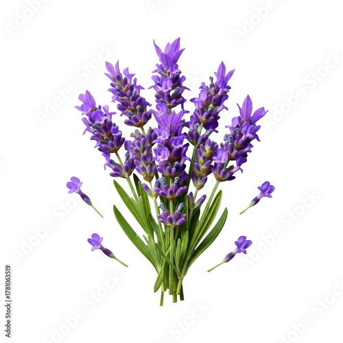 © Greg, Naklejka premium Vibrant lavender (Lavandula angustifolia) sprigs with purple blossoms and green leaves, detailed florets on a seamless transparent background, studio shot. Concept of natural freshness