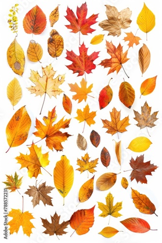 Fototapeta premium Vibrant leaves in various hues on a clean white surface. Perfect for seasonal...