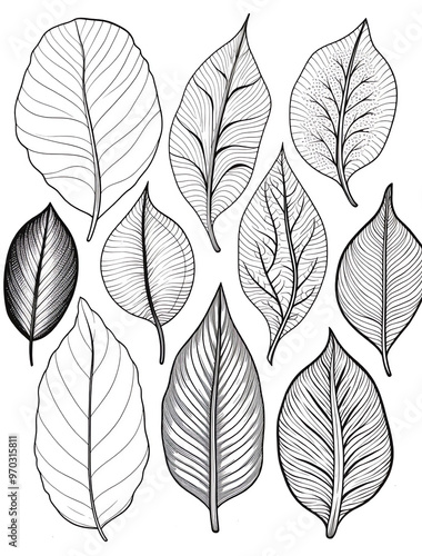 © Kitty, Fototapeta premium Vibrant leaves in various shapes and sizes, a coloring page for adults, with thick lines, in black and white, and grayscale
