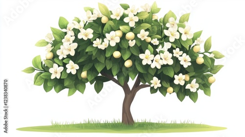 © Sakdecha, Fototapeta premium Vibrant Lemon Tree with Blossoms and Bright Fruit on White Background
