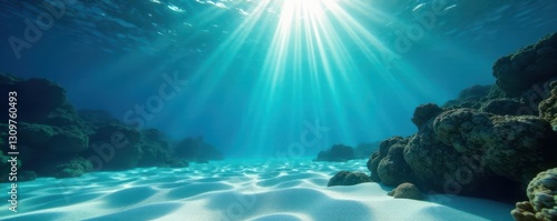 Naklejka premium Vibrant light rays illuminate sandy underwater landscape, deep blue hues, scene, underwater scene, underwater