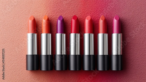 © Atmospheric stock, Obraz premium Vibrant lipstick collection displayed on textured surface in bold colors