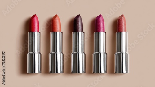 Fototapeta premium Vibrant Lipsticks Displayed in a Line with Various Shades on a Neutral...