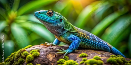 © Danicha, Fototapeta premium Vibrant Lizard with Striking Blue Belly Resting on a Rock Amidst Green Foliage in Nature