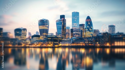 © Fana Art, Naklejka premium Vibrant London City Skyline at Twilight with Iconic Skyscrapers and Golden River Reflections, Tilt-Shift Effect