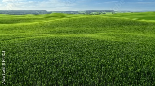 © Asree, Fototapeta premium Vibrant lush green grass meadow with soft sunlight, gentle breeze, and a peaceful atmosphere, ideal for backgrounds in nature, relaxation, or environmental themes. The scene features rich green grass