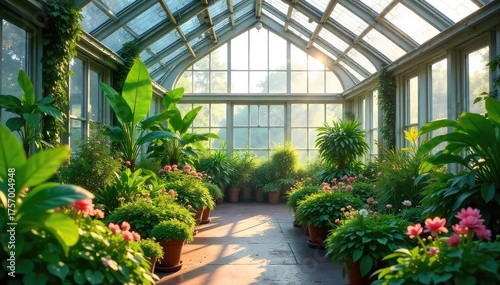 © vilavanh, Fototapeta premium Vibrant, lush greenery thrives within a spacious greenhouse, sunlight streaming through the glass panes, illuminating a variety of plants and flowers , glasshouse, vibrant