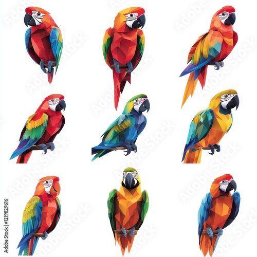 © chanchai, Obraz premium Vibrant Macaw Collection: A set of twelve vibrant, geometric macaws in various colors and poses. Perfect for adding a tropical flair to your designs.