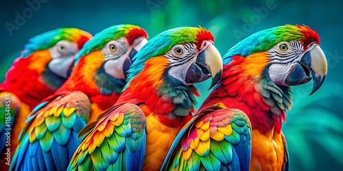 © Arnada, Obraz premium Vibrant Macaw Feathers Teal Background Macro Photography Stock Photo
