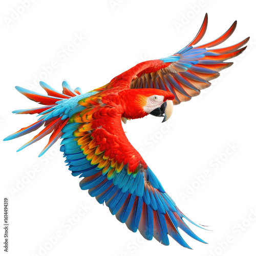 © ABU, Fototapeta premium Vibrant macaw in flight against a black background. Colorful plumage, wide-spread wings, dynamic pose