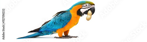 Fototapeta premium Vibrant Macaw Parrot Holding Peanut Against White Background in Natural Habitat