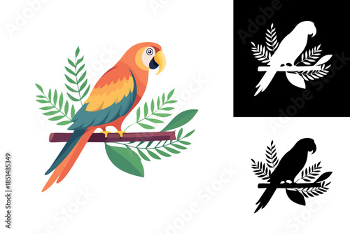 © Rusdan, Obraz premium Vibrant Macaw Parrot Perched on a Branch Surrounded by Lush Green Foliage