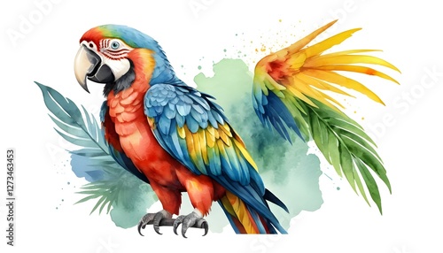 Fototapeta premium Vibrant Macaw Parrot with Tropical Leaves Watercolor Painting