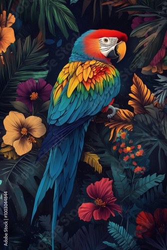 Fototapeta premium Vibrant macaw perched on blooming flowers in a lush tropical setting under soft lighting