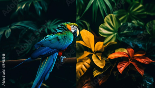 © djvstock, Fototapeta premium Vibrant macaw perching on green rainforest branch generated by AI