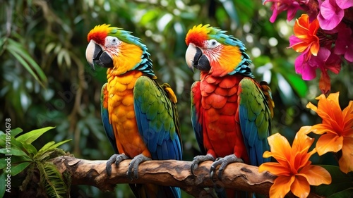 Fototapeta premium Vibrant Macaws Perched on Branch surrounded by tropical flora in a lush rainforest scene