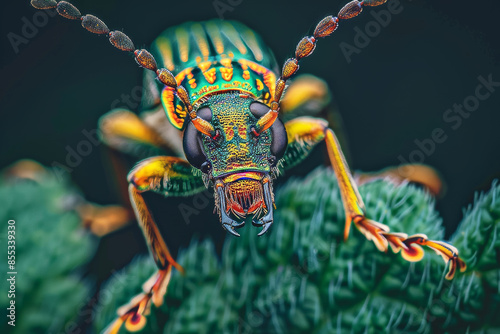 © Iuliia, Fototapeta premium Vibrant macro shot iridescent beetle close up in jungle setting, gazing at camera