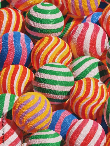Obraz premium Vibrant Macro View of Colorful Striped Candy Balls Showcasing Hyperrealistic Repeating Patterns in Bright Tones