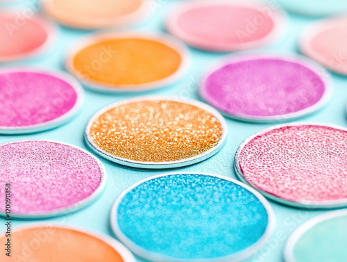 Naklejka premium Vibrant makeup eyeshadow pans in various shimmering colors arranged on pastel background