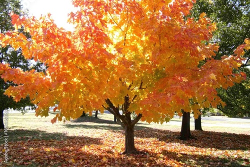 © kqdd, Naklejka premium Vibrant maple tree in autumn color, city park scene, orange and red leaves, sunlight, long shadows, fall landscape