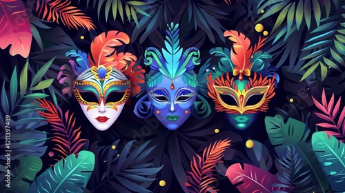 © Force, Naklejka premium Vibrant Mardi Gras Carnival Masks with Feathers in Different Styles