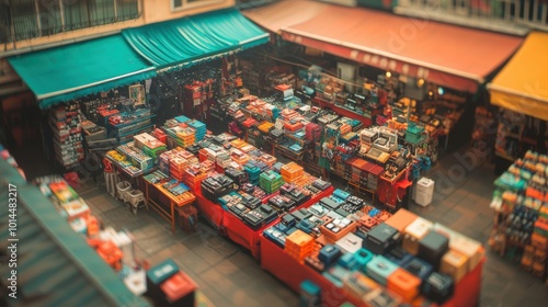© Saranpong, Naklejka premium Vibrant market stalls with colorful goods, aerial perspective.
