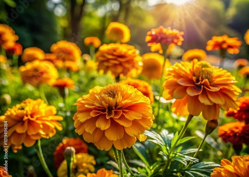 © Danicha, Fototapeta premium Vibrant Mary's Gold Flowers Blooming in a Sunlit Garden with Green Foliage Background