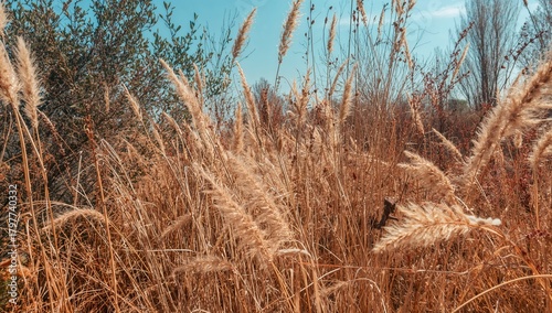 Fototapeta premium Vibrant meadow displaying dried vegetation in distinctive retro tones, seasonal change