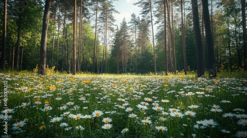 Obraz premium Vibrant Meadow Filled with Wildflowers Under the Warm Sunlight in a Serene Forest Landscape