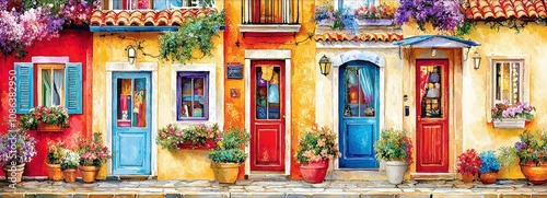 © BonzEarthsnapper, Fototapeta premium Vibrant Mediterranean Street with Colorful Doors and Flowering Plants in Pots Showcasing Charming Architecture and Lively Atmosphere in a Quaint Coastal Village