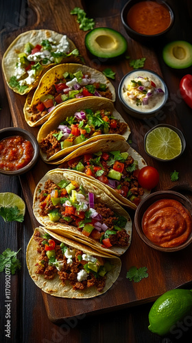 Fototapeta premium Vibrant Mexican Tacos with Diverse Toppings Celebrating Authentic Cuisine